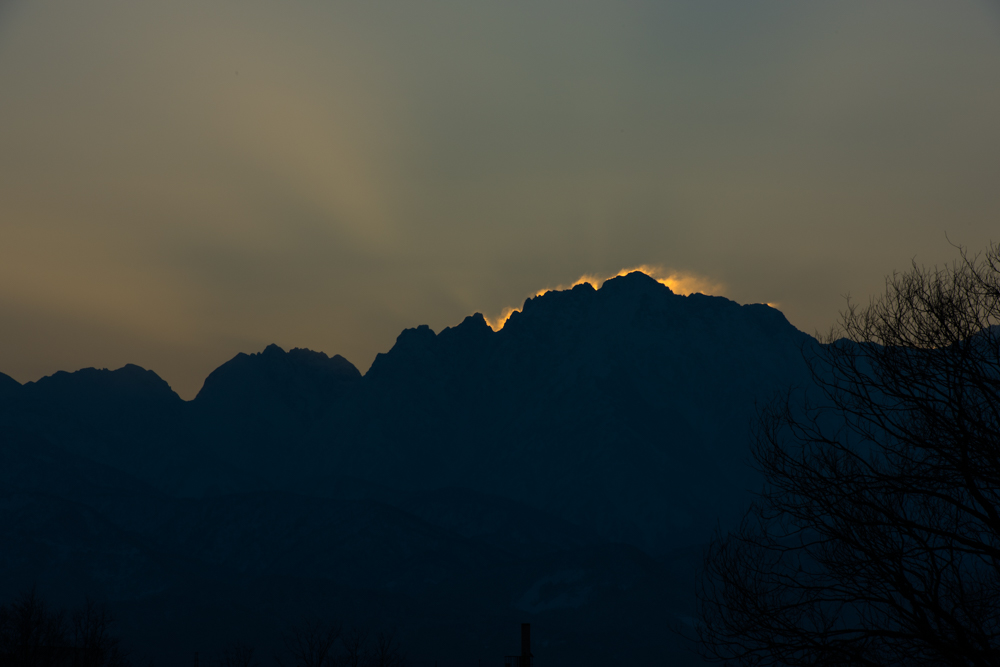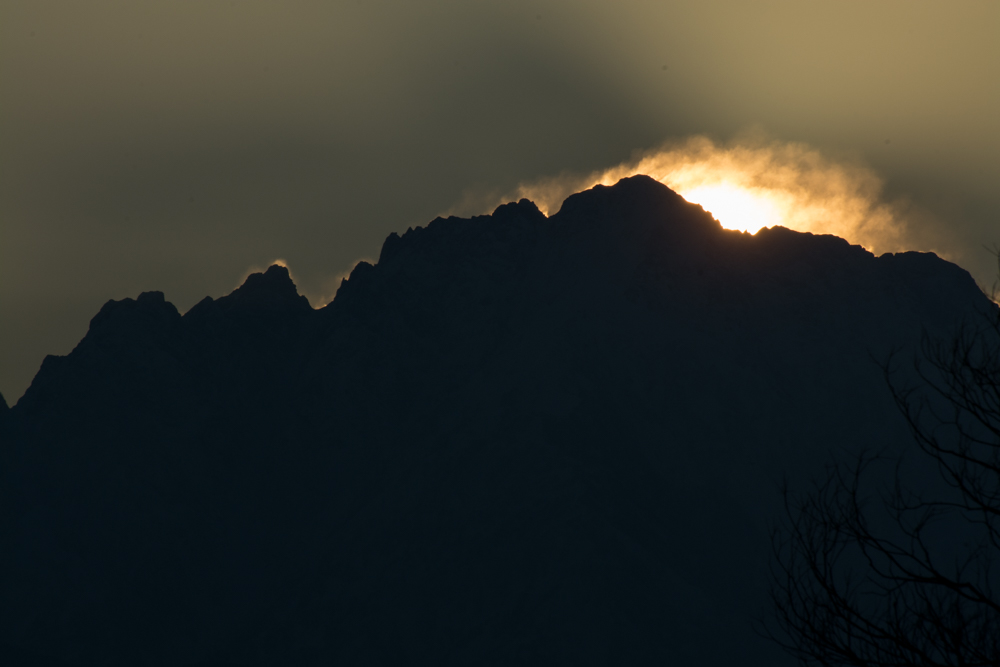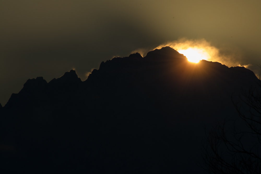 7:12頃 ちょっとだけ顔を出したところをピカッとした感じのイメージの写真になるように、F20に絞ってみたけど、山頂あたりのガスを受けてボヤっとなってしまった(^^ゞ