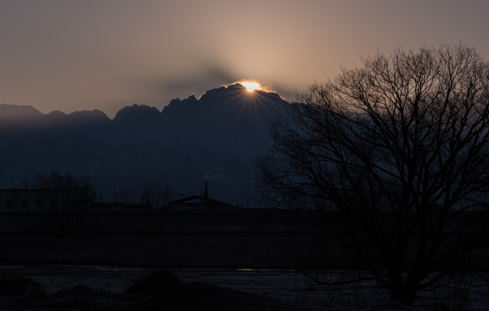 日の出日の入り方向をWEBで確認しつつ、雨晴からは既に剱岳の左に見えるのでと考えてだいたいこの辺かなという場所。