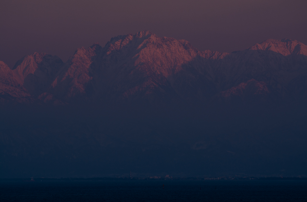 立山連峰が夕日に染まる。