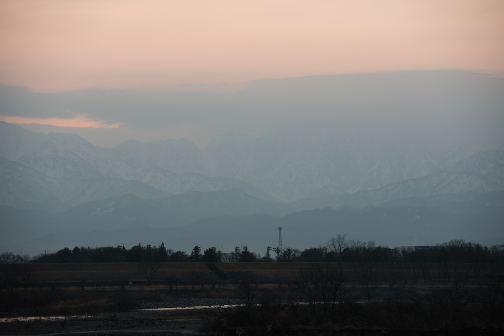 5時半くらいに車を走らせてると、なんか立山の方は霞んでる感じ。